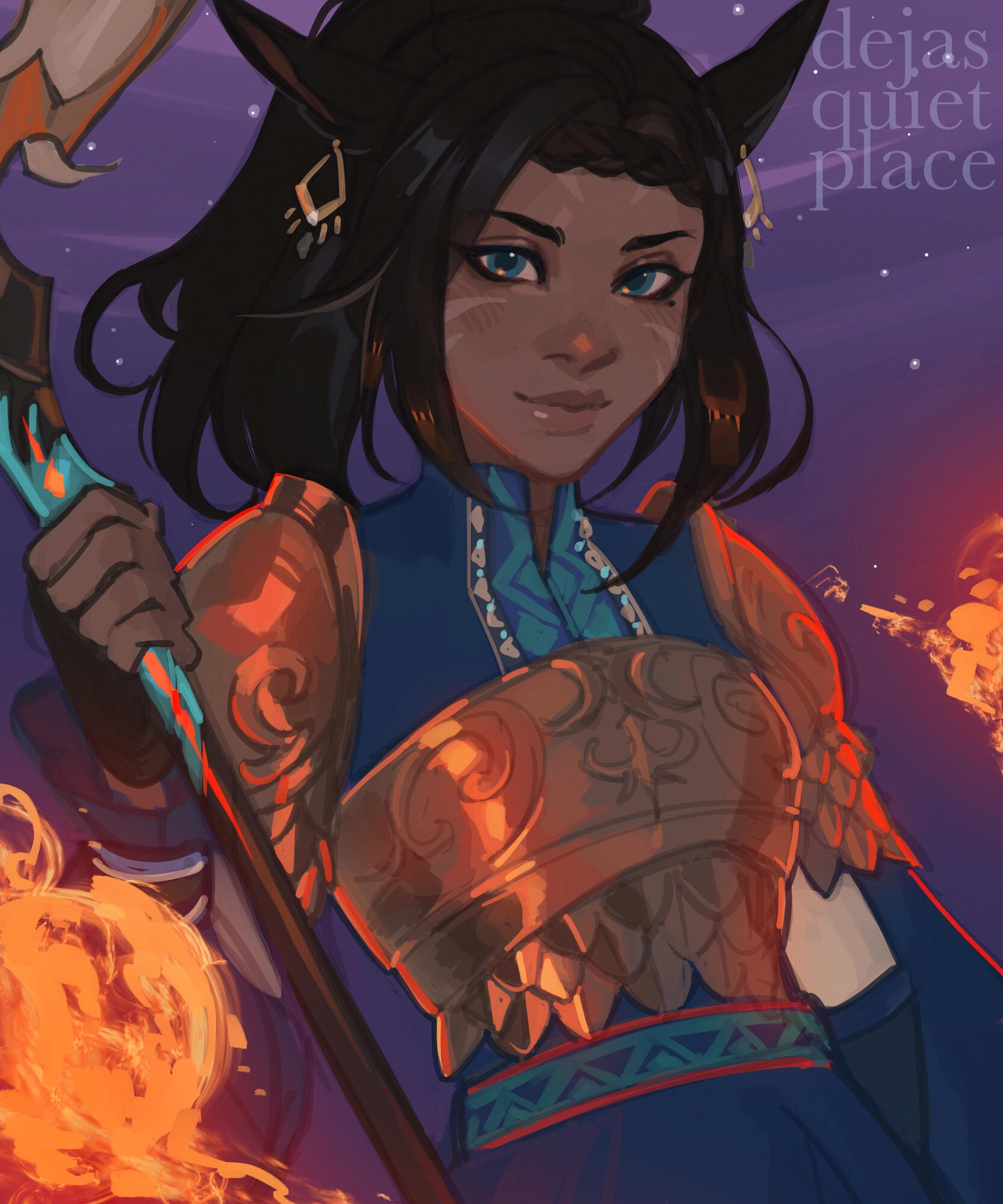 the youngest of the dawnshard family, tsuyuna grew up with a dangerous combination - a lack of oversight and a surprising amount of grace. a hedonistic troublemaker with a penchant for bare-knuckle brawling during her younger days, she was more likely to be found in taverns than training yards and causing problems instead of solving them.